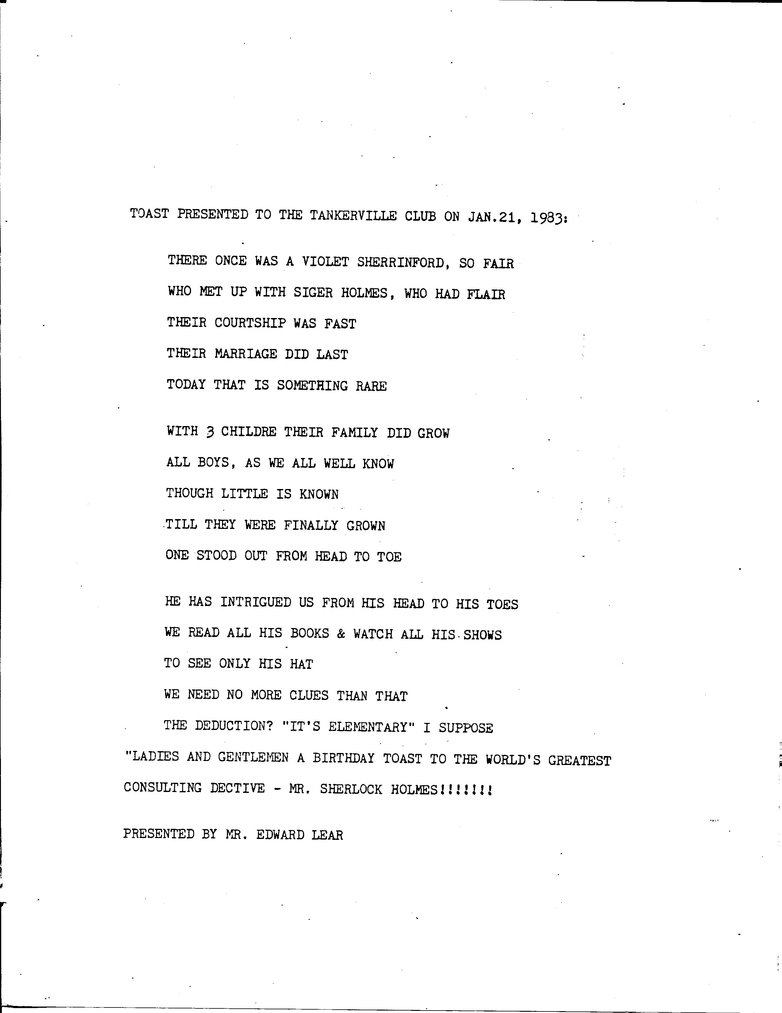 | Edward Lear | Holmes | Tankerville Club | 1983-1-21 |
