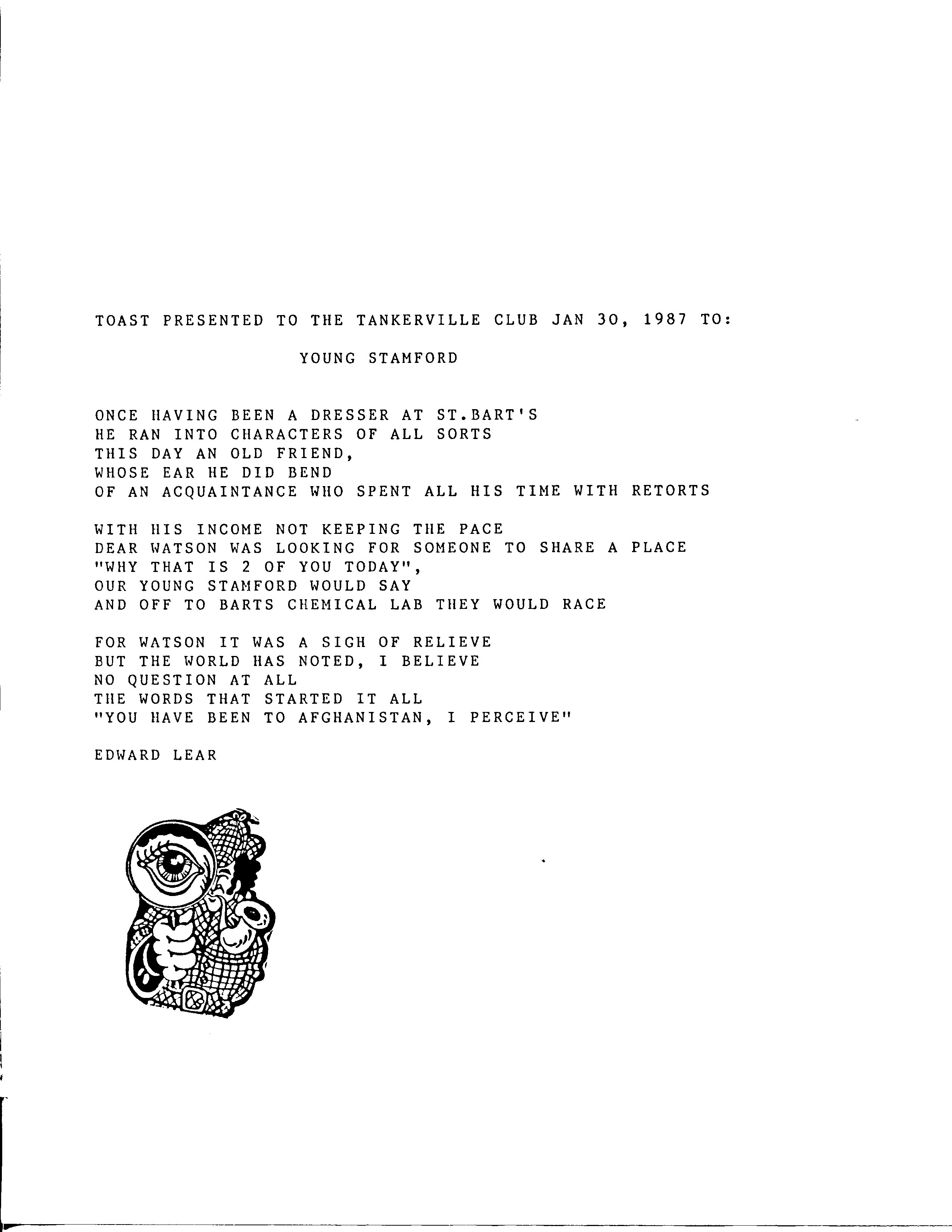 | Edward Lear | Stamford | Tankerville Club | 1987-1-30 |